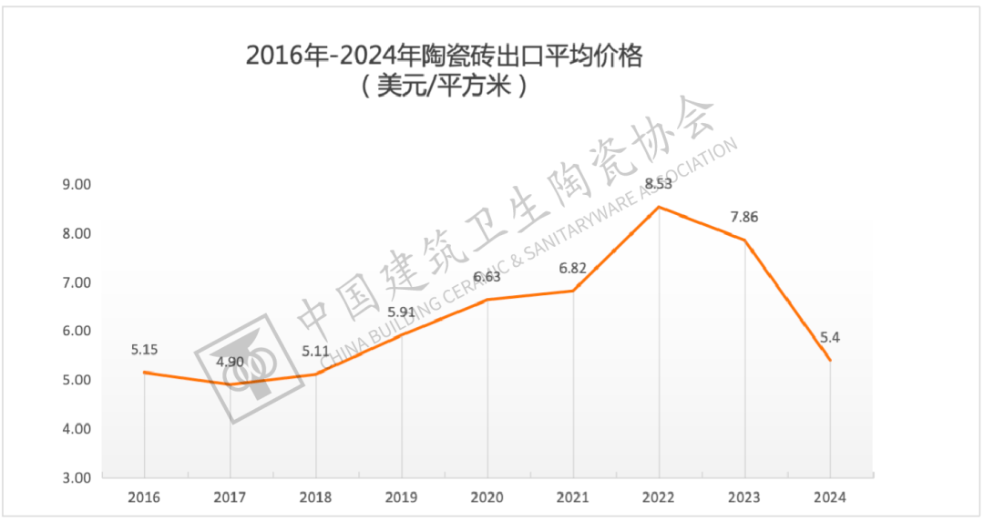 2024年,我国陶瓷砖出口呈现“量稳价跌、布局承压”的阶段性特征。较2023年的6。18亿平方米微降2。86%,正在近年波动区间(5。8-6。2亿平方米)内,显示出海外市场需求的韧性支持。出口单价从7。86美元/平方米下跌至5。40美元/平方米(-31。30%),导致出口额从48。56亿美元降至32。41亿美元,同比降幅达33。26%,为近八年新低,反映出出口产物正在国际市场临的价钱合作窘境。