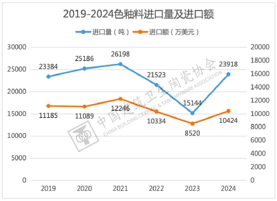 2024年,色釉料产物进口量为2。39万吨,同比大涨57。94% ,进口额1。04亿美元,上涨22。35%,显示出国内制制企业对进口原料需求的增加。