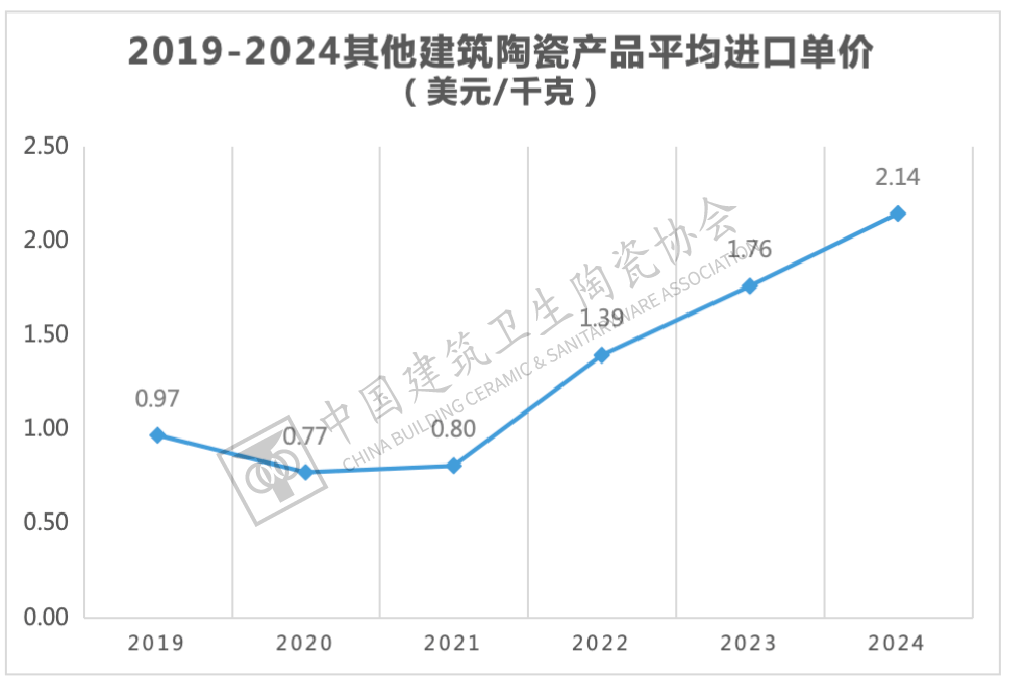 2024年,陶瓷砖进口平均单价32。22美元/平方米,较2023年下降11。56%,仍处于近年的高位。