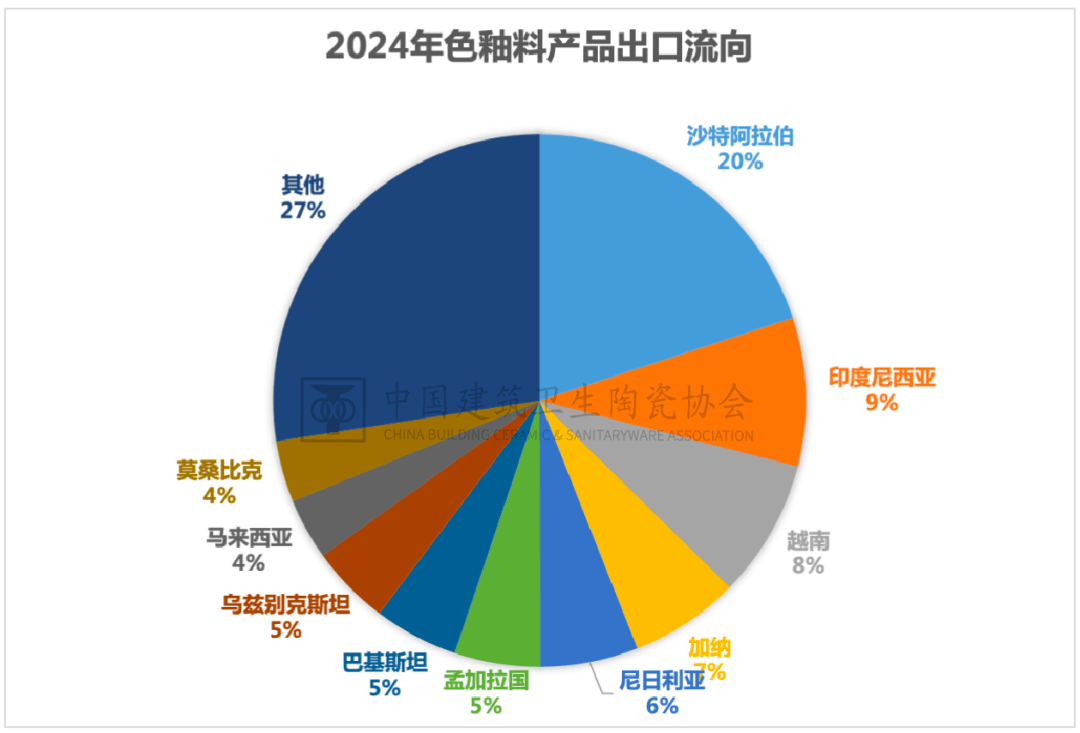 2024年,向前十个次要国度或地域的出口色釉料产物总量为37。44万吨,占出口总量的73%,集中度进一步下滑(较2023年下滑4个百分点),市场呈现分离趋向。
