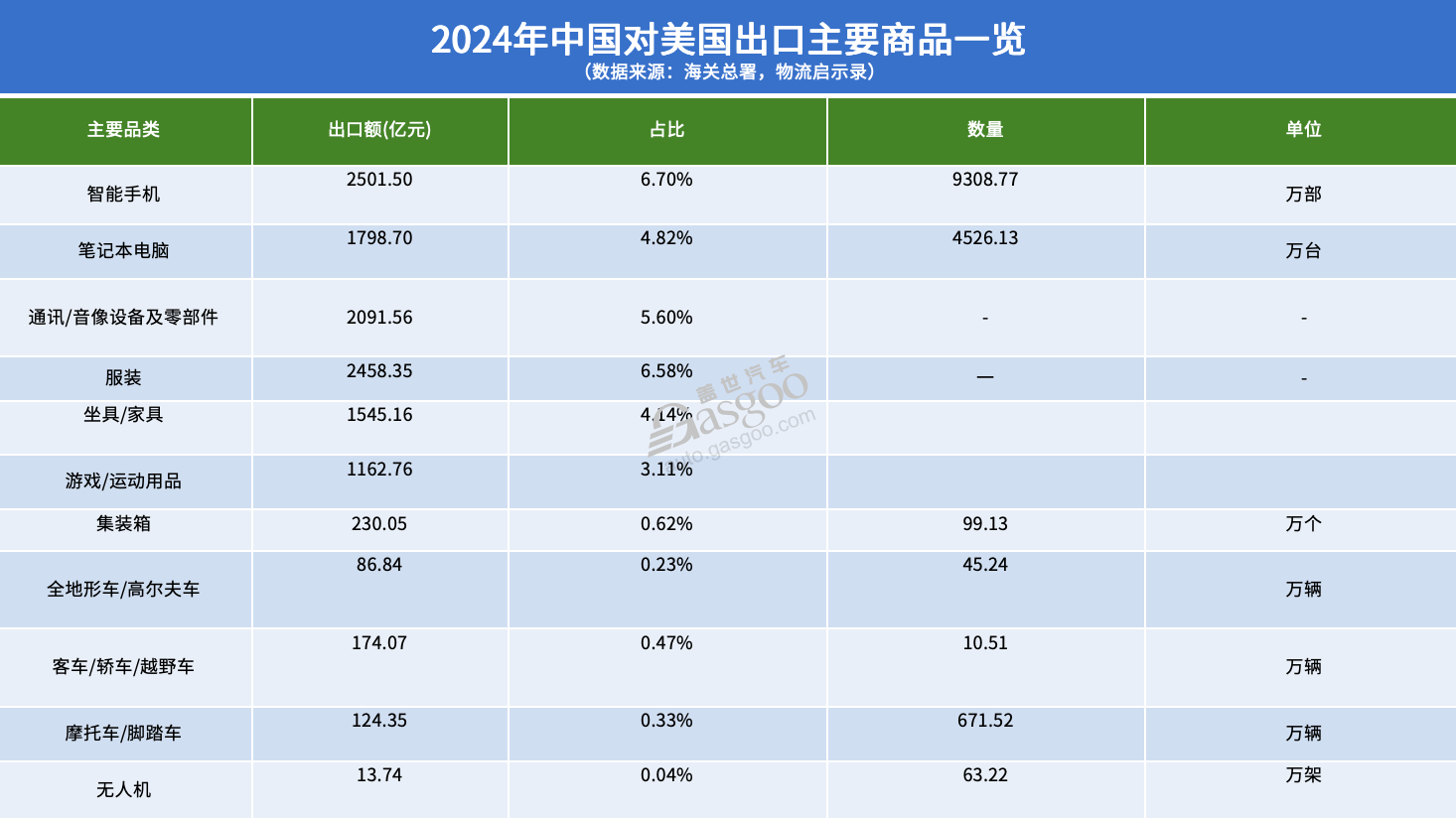 数据显示,2024年,中国对美国的出口总额达到了37337。2亿元,同比增加了4。9%;而从美国进口的商品总额为11640。61亿元,较着呈现商业顺差。通过度析两国的进出口商品布局,能够看出较着的财产互补和分工特点。中国对美国出口的次要产物集中正在机械电子类,占出口总额的41。45%,达15475。84亿元。此中,智妙手机(2501。50亿元)、此外,纺织鞋服类产物(4686。26亿元)和家具/玩具/活动杂项成品(4594。61亿元)别离占出口总额的12。55%和12。31%,配合形成了中国对美出口的三大支柱。而中国从美国进口的商品则以高科技和资本类产物为从。机械电子类产物占进口总额的23。17%(2697。30亿元),此中集成电(838。77亿元)和半导体系体例制设备及零部件(319。46亿元)是环节构成部门。值得出格关心的是,中国从美国进口的航空器、航天器及其零件的依存度高达50%,这是中国对美进口依赖度最高的产物类别,农副食物类占进口总额的16。33%(1901。20亿元),其曲达基因黄大豆的进口额为856。48亿元,占比7。36%。能源类产物则是第三大类进口商品,占比14。12%(1643。34亿元),次要包罗液化丙烷/丁烷(827。44亿元)和原油(428。53亿元)。正在汽车财产方面,中国对美国的出口包罗全地形车/高尔夫车(86。84亿元)、客车/轿车/越野车(174。07亿元)和摩托车/脚踏车(124。35亿元),占出口总额的约1%。取此比拟,中国从美国进口越野车/小轿车/小客车达517亿元,占进口总额的4。4%,