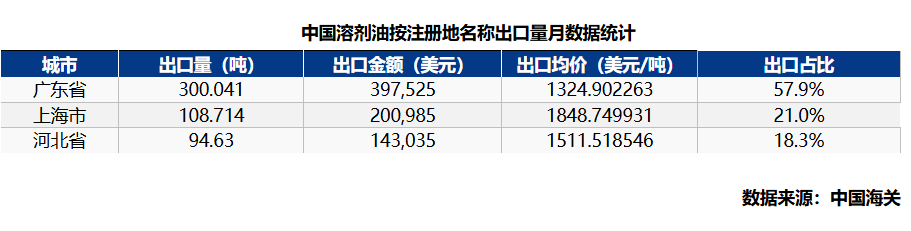 从出口地域环境看,广东省、省,约占出口总量的96%,广东省是国内溶剂油出口次要省分,占国内出口总量的56%。