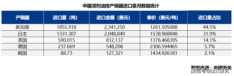 从进口来历国环境看,排名前五位的国度/地域有新加坡、日本、、美国和韩国约占进口总量的95%,新加坡是国内溶剂油进口次要来历国,占国内进口总量的45%。