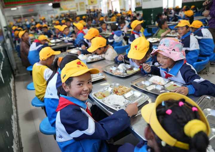林芝市工布江达县娘蒲乡核心小学学生正在食堂用餐(2024年9月3日摄)。记者 晋美多吉 摄。