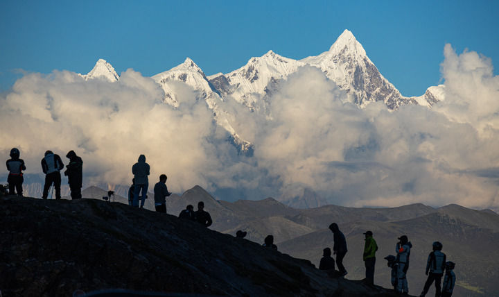 旅客正在色季拉山口的川藏公边抚玩南迦巴瓦峰风光(2023年9月5日摄)。记者 丁增尼达 摄?。