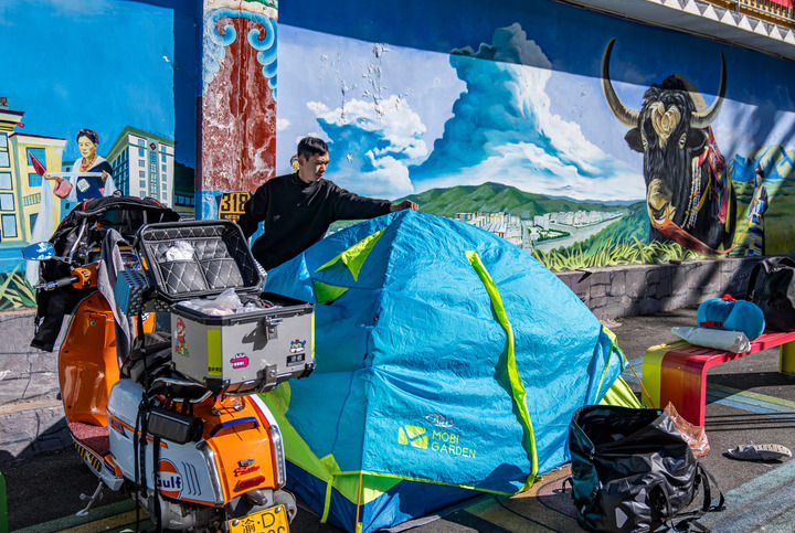 经国道318线前去旅逛的沉庆旅客张静正在芒康县如美镇拉乌村拾掇帐篷(2023年10月20日摄)。记者 孙非 摄。