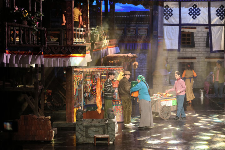 2022年3月23日,话剧《八廓街北院》正在自治区藏戏演艺核心上演。该剧由自治区话剧团创做表演,以拉萨八廓街为布景,展示了一座多平易近族聚居院落的邻里密意。记者 摄。