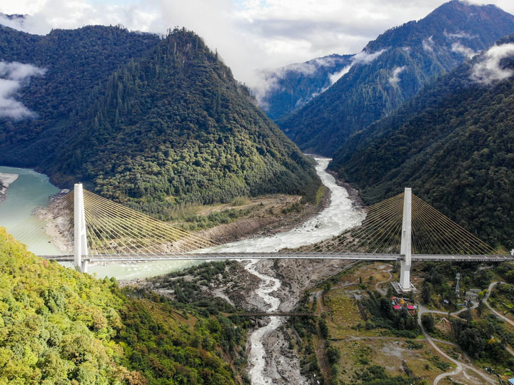 2019年10月27日拍摄的川藏公通麦段上的迫龙沟特大桥(无人机照片)。迫龙沟特大桥位于林芝市波密县境内,是自治区内最大的公双塔斜拉桥。记者 孙非 摄。