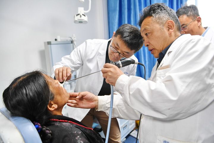 中国医学科学院整形外科病院明博士(左后)和自治区人平易近病院巴罗从任(左前)为患者查体(2024年8月27日摄)。记者 张汝锋 摄。