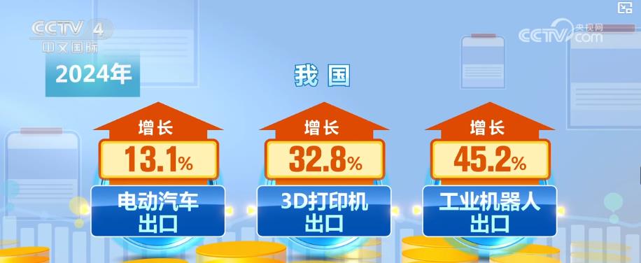 我国外贸出口布局持续优化,产物“新”意更脚,更多高科技属性的新产物加快出海。我国电动汽车、3D打印机、工业机械人出口别离实现了13。1%、32。8%、45。2%的增加。