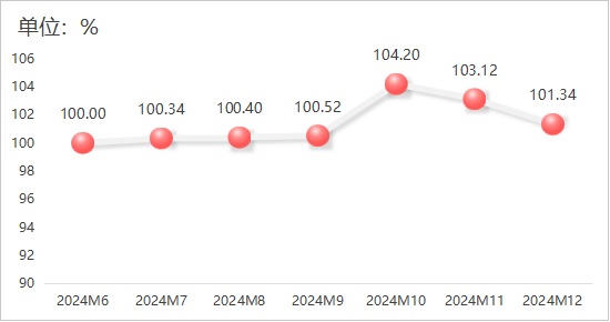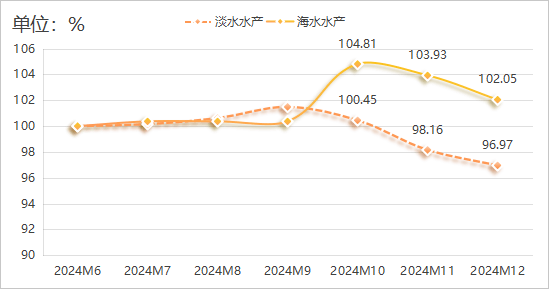 2024年12月,水产产物价钱指数再度回落,指数值为101。34点,环比下降1。73%。具体运转环境如下图所示。
