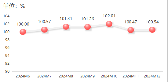2024年12月,大米产物价钱指数小幅回升,指数值为100。54点,较上月增加0。07个百分点。具体运转环境如下图所示。
