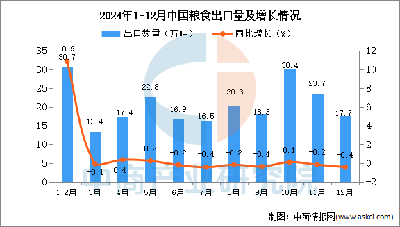 中商谍报网讯:据中商财产研究院数据库显示,同比下降0。4%;1-12月我国粮食累计出口量226万吨,